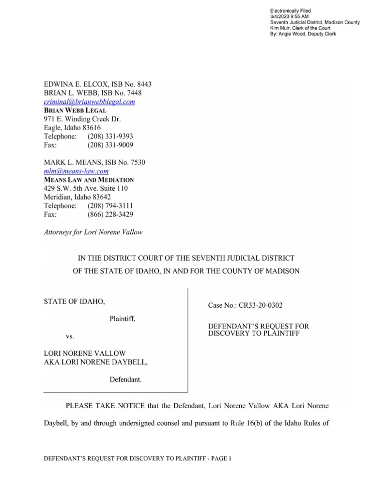 Request for Discovery filed by Lori Vallow's attorneys Discovery (Law) Prosecutor
